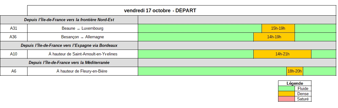 Vendredi 17 octobre, dans le sens des départs, les difficultés de circulation devraient se concentrer en Bourgogne et dans l’Est, en particulier sur les autoroutes A31 et A36. En Île-de-France, à partir du milieu de l’après-midi, la circulation sera dense sur les autoroutes A6 et A10. Les premiers départs viendront s’ajouter à ceux occasionnés par les déplacements générés par l’activité économique du vendredi après-midi, les trajets pendulaires et les départs habituels en week-end. En cette période, la circulation peut s’avérer difficile, surtout si les conditions météorologiques sont mauvaises.