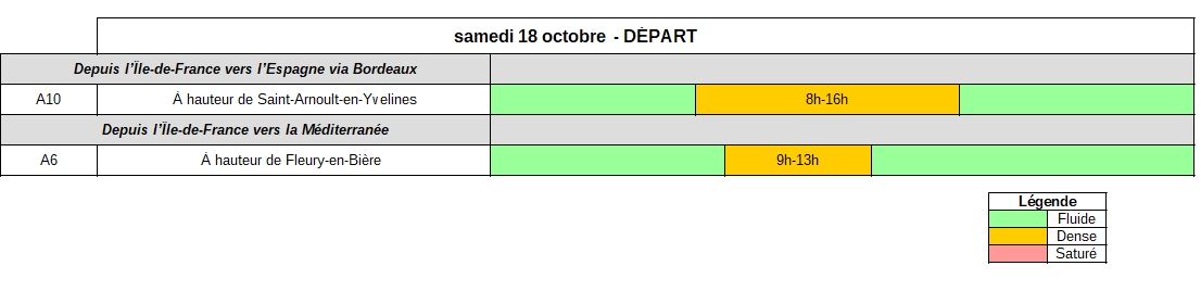Samedi 18 octobre, dans le sens des départs, en Île-de-France, à partir du milieu de la matinée, une circulation plus dense qu’à l’accoutumée sera observée en direction des barrières de péages des autoroutes A6 et A10. Des difficultés de circulation pourraient apparaître entre le milieu de la matinée et le début de l’après-midi.