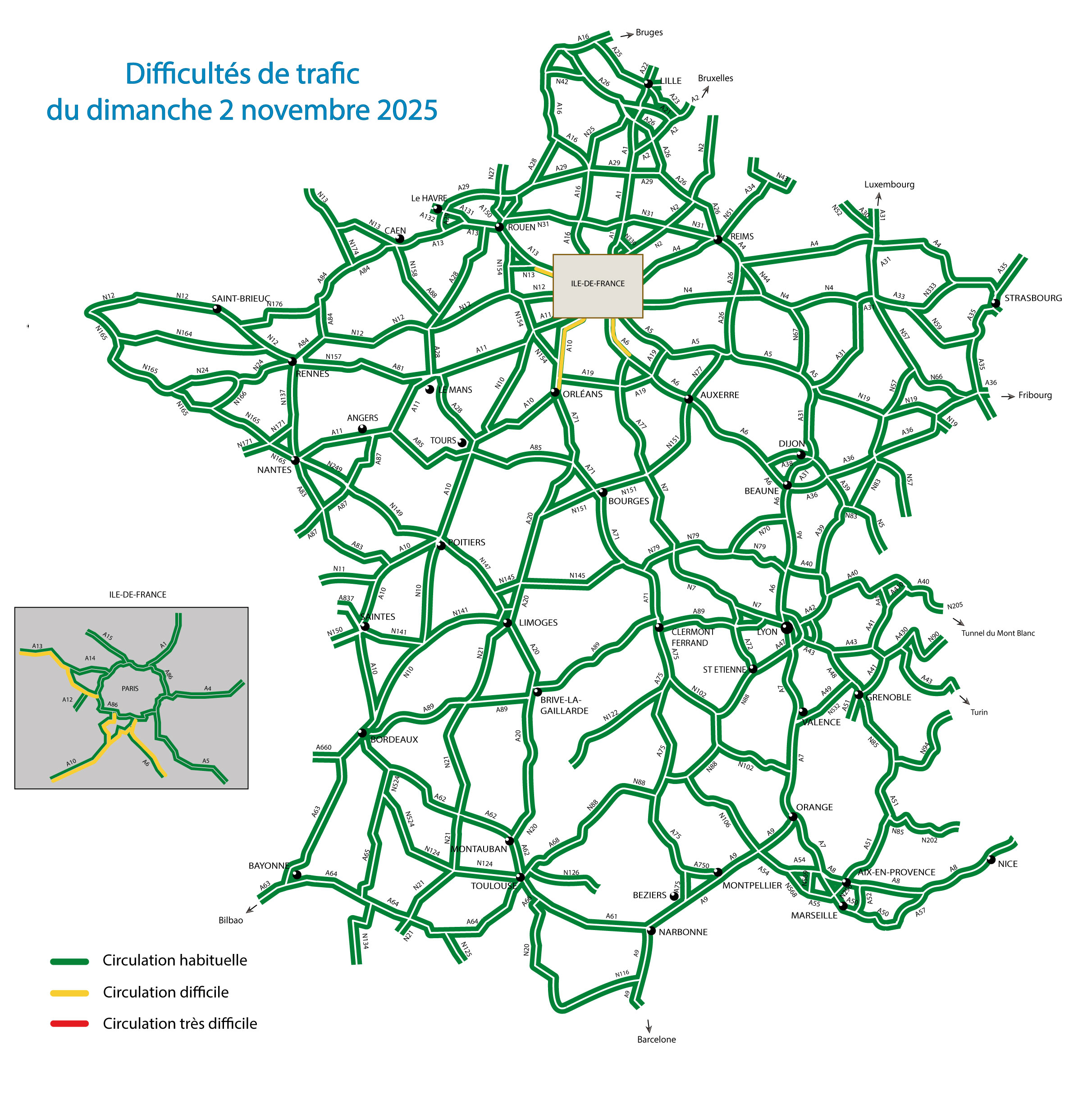 Samedi 1er novembre, dans le sens des retours, en Île-de-France, on pourra observer une circulation plus dense qu’à l’accoutumée à partir du milieu de l’après-midi, notamment sur l’autoroute A10. Elle sera renforcée par les nombreux déplacements engendrés par la Toussaint et ainsi prolonger les difficultés jusqu’en en début de soirée.