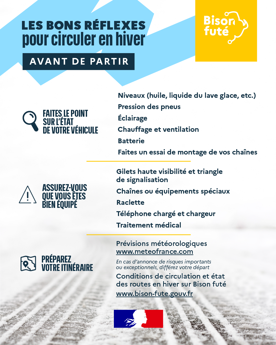 Les conditions climatiques hivernales peuvent rendre les routes difficilement praticables et particulièrement dangereuses. Pour rouler en toute sécurité, il est nécessaire d’adapter sa conduite et prendre un certain nombre de précautions telles que :